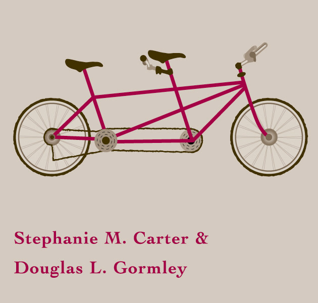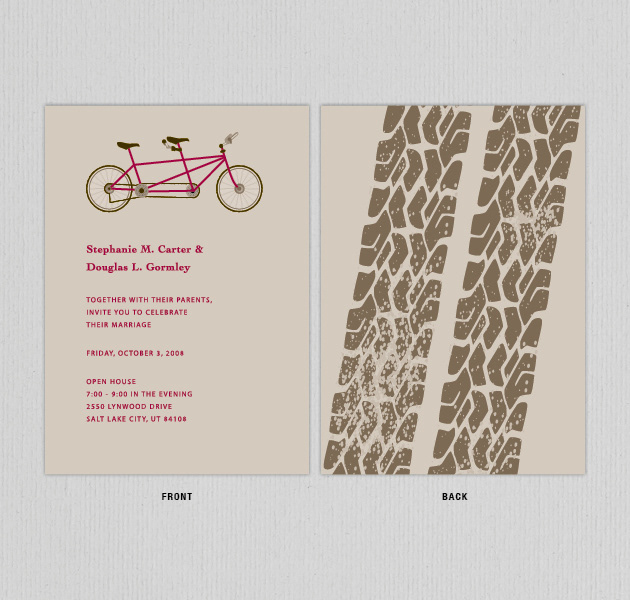 Custom invitation design including illustration of a tandem bike and tread marks.